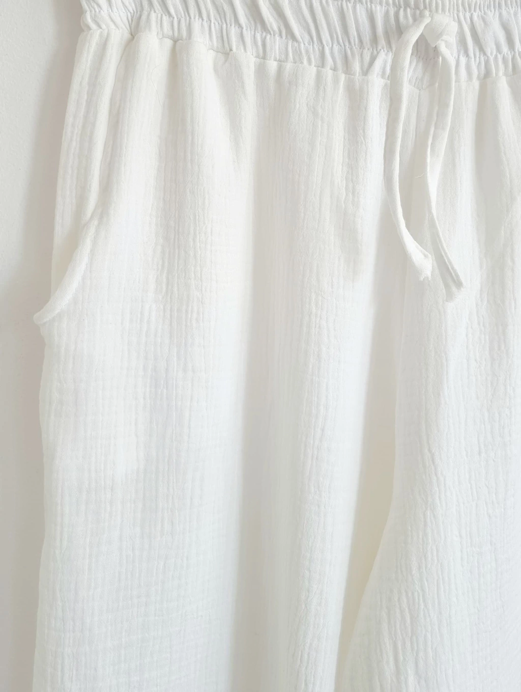 Bolsillos y Cintura elastizada con tiritas al frente.