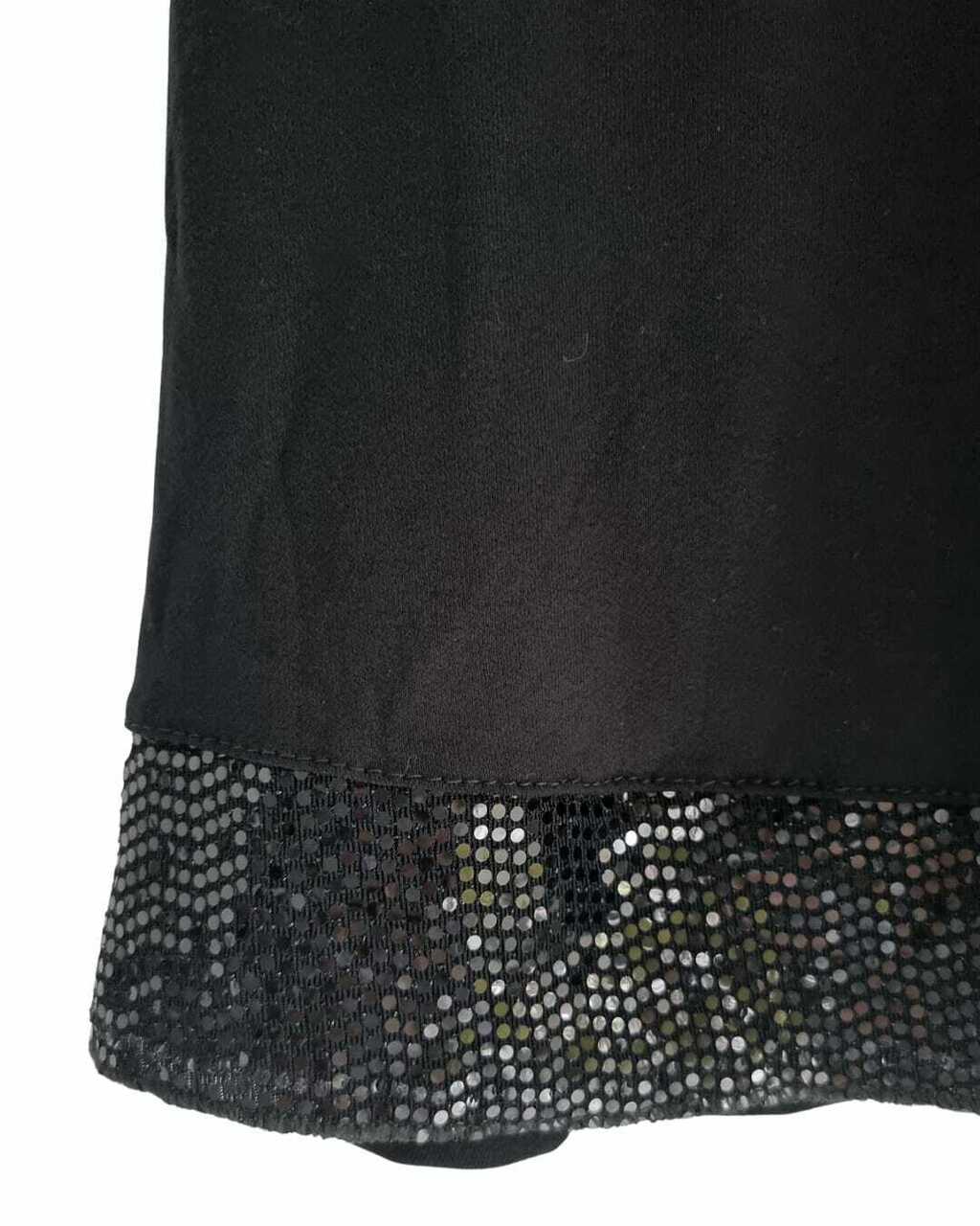 ?Musculosa confeccionada en creppe Viscosa con lycra, con tela combinación texturada brillante ( pequeños circulos brillantes ) en escote y ruedo.