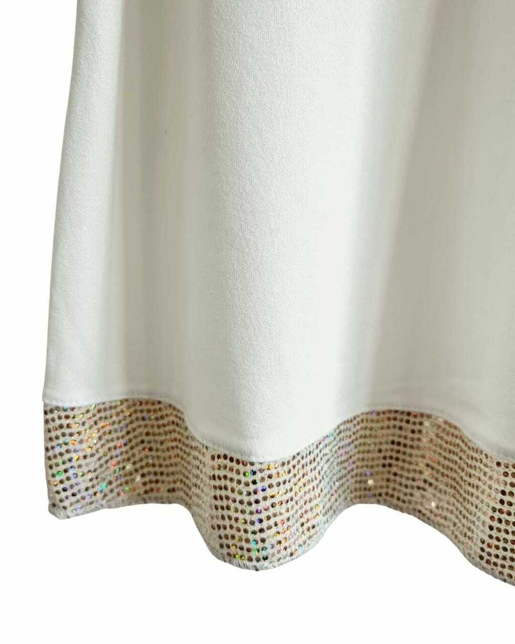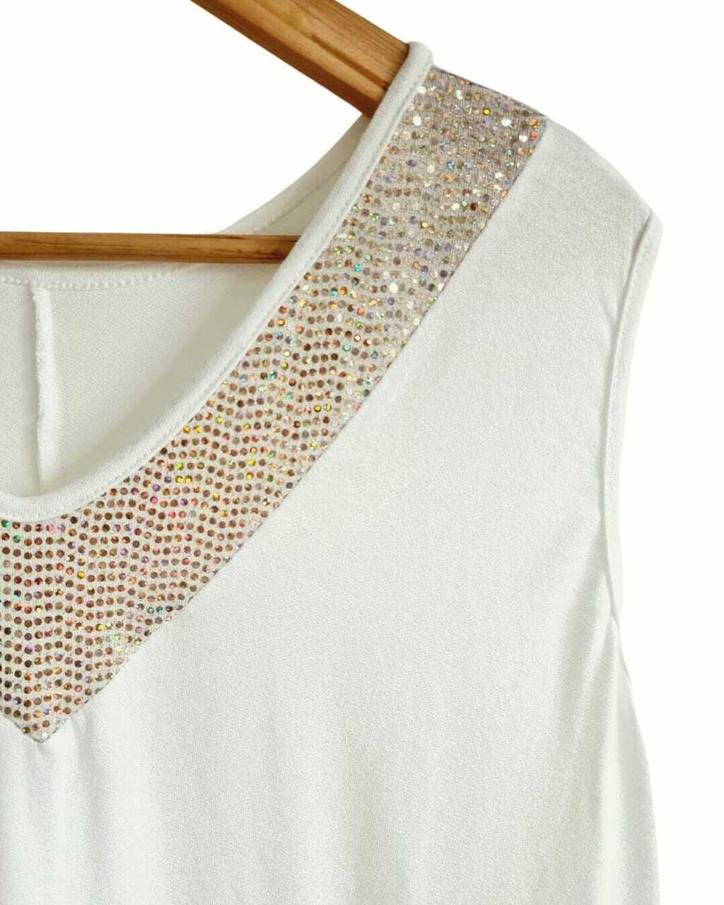 ?Musculosa confeccionada en creppe Viscosa con lycra, con tela combinación texturada brillante ( pequeños circulos brillantes DORADOS ) en escote y ruedo.