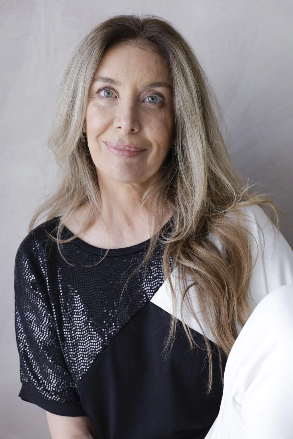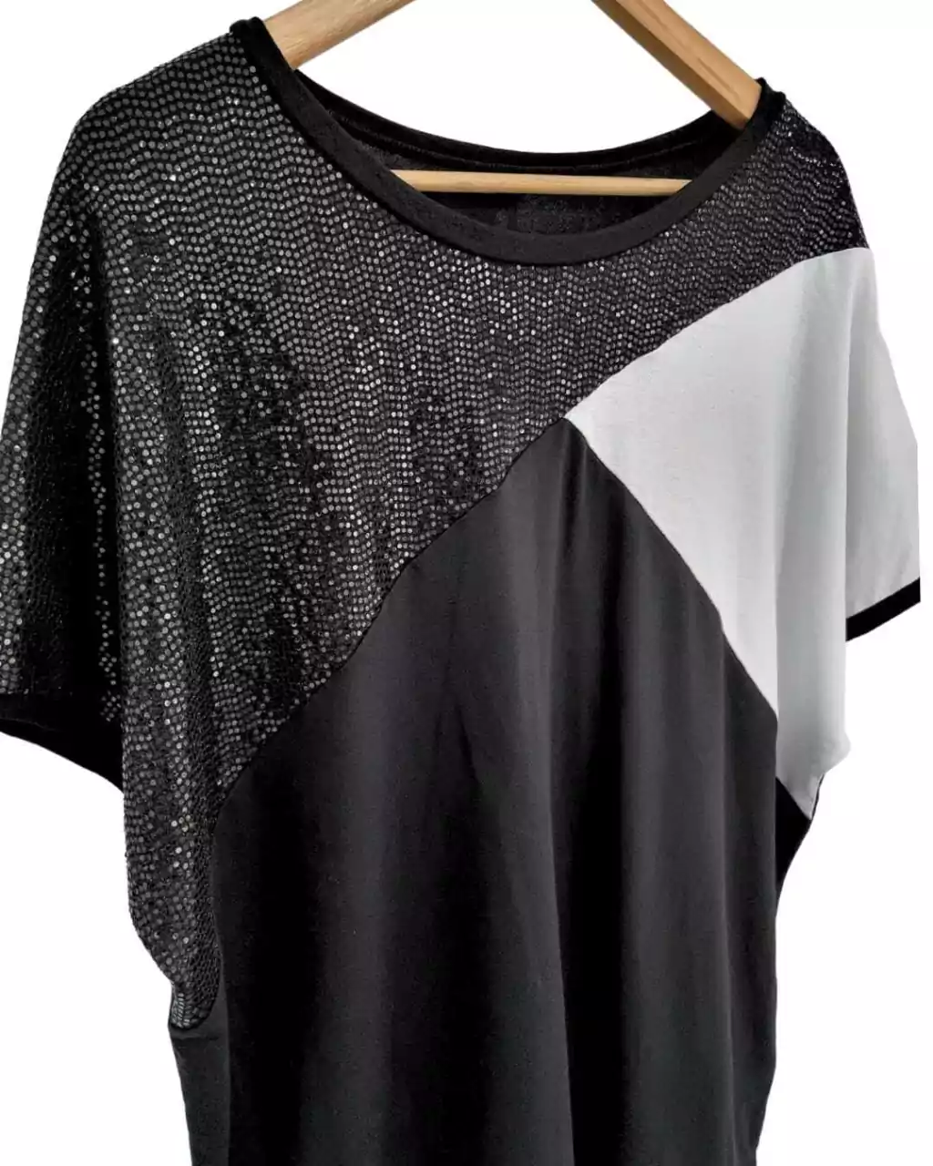 ?Remera confeccionada en creppe Viscosa con lycra, con recortes de tela combinada en tonos neutro, negro y blanco.