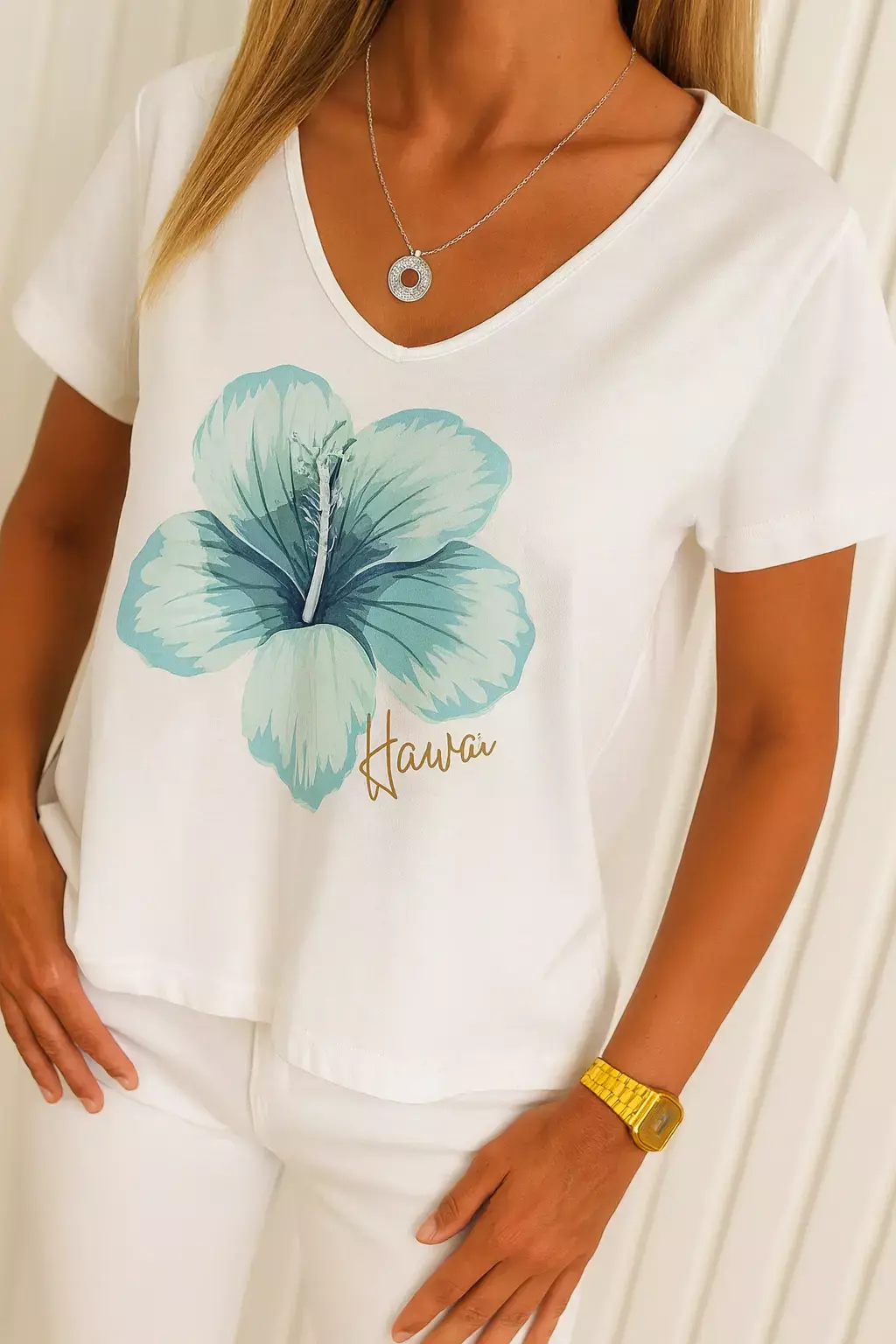 Remera Manga Corta, Escote V confeccionada en Algodón premium con estampa en frente